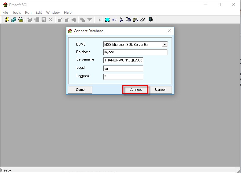 2. จะปรากฎหน้าต่างเชื่อมต่อฐานข้อมูลที่ถูกตั้งค่าไว้แล้ว ให้กด Connect