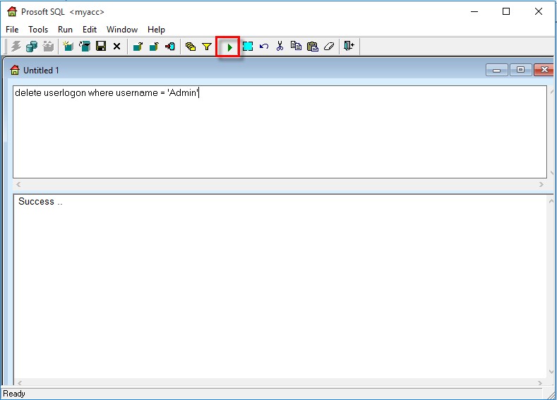 6. หลังจาก Backup เสร็จแล้วให้ใช้คำสั่ง delete userlogon where username = 'ชื่อ User ที่ค้าง' (ใส่ชื่อ user ที่ค้างในระบบให้ถูกต้อง) แล้วกด Execute