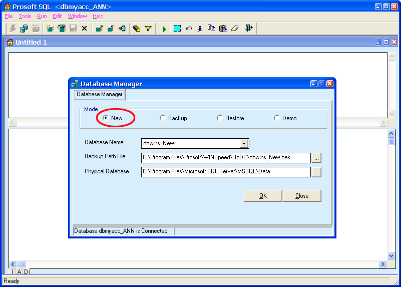 5. เมื่อเข้ามาหน้าจอนี้จะมี Mode ให้เลือก New คือการสร้าง Database