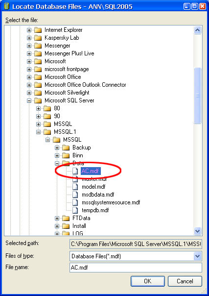 3. เลือกไฟล์ที่เก็บไว้ ซึ่งต้องเลือกเป็นไฟล์ .mdf แล้วก็ Click OK