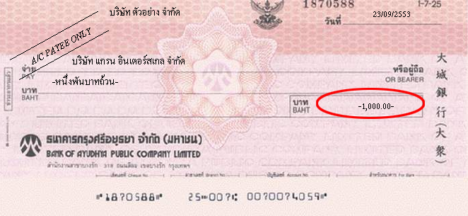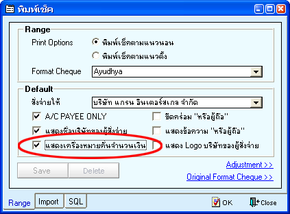 หน้าต่างพิมพ์เช็ค เลือก Option “แสดงเครื่องหมายคั่นจำนวนเงิน” จากนั้นกด OK