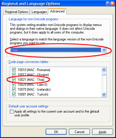 5. เมื่อทำการติดตั้ง Windows ไว้แล้วให้เข้าไปที่แถบ Advanced แล้วทำการตรวจสอบว่ากำหนดเลือกไว้เป็น Thai หรือไม่ถ้าไม่ได้เลือกให้ทำการกำหนดตามรูปด้านล่างแล้วกด OK กรณีที่ไม่มี Thai ให้เลือกที่ช่อง Language for non-Unicode programs ให้ทำการเลื่อนหาที่ช่อง Code page conversion tables เพื่อหาภาษา Thai แล้วติ๊กที่ช่องสีเหลี่ยม ดังรูปที่ส่งมาให้จะสามารถหา Thai เจอที่ช่อง Language for non-Unicode programs แล้วเลือกที่ปุ่ม OK