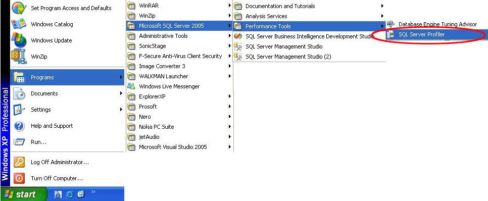 1. ไปที่ Start > Program > Microsoft SQL Server 2005 > Performance Tools > SQL Server Profiler