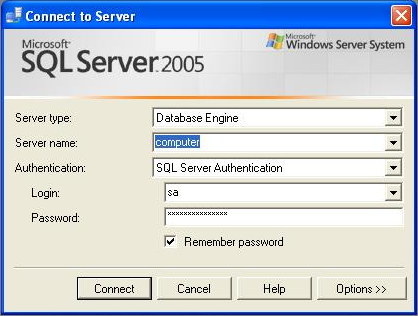 b. หน้าต่าง Connect to Server ระบบจะกำหนดค่า default ให้อัตโนมัติ ซึ่งในส่วนของ Password หากขั้นตอนการลง SQL 2005 มีกำหนดไว้ จะต้องระบุลงไปก่อน