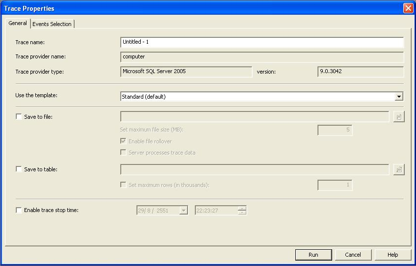 c. หน้าต่าง Trace Properties > กด Run เพื่อเข้าสู่หน้าต่างการทำงานของ SQL Profiler