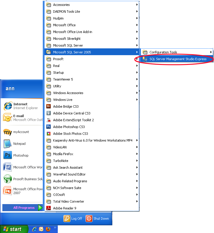 1.คลิกเลือก start>Programs>Microsoft SQL Server 2005>SQL server Management Studio