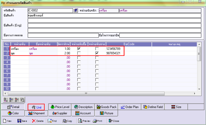 Tab Unit กำหนด Barcode สินค้าตามอัตราส่วนหน่วยนับที่ใช้ ดังภาพ