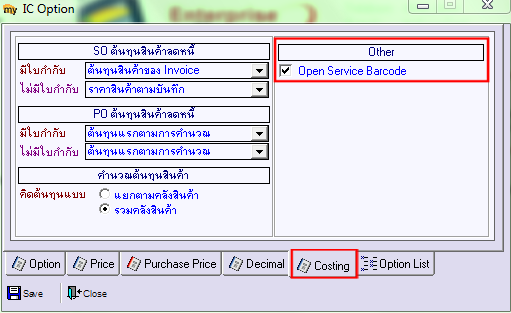 - หน้าต่าง IC Option / Tab Costing : กำหนดที่ส่วนของ Other เลือก "Open Service Barcode" ดังภาพ เมื่อใช้งานโปรแกรม ยกตัวอย่าง หน้าจอขายเชื่อ เปิดหน้าต่างขายเชื่อขึ้นมาจากนั้นนำตัวยิง barcode scan ที่สินค้าโปรแกรมก็จะแสดงข้อมูลให้อัตโนมัติ