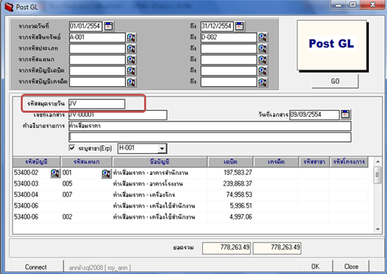 ตรวจสอบการกำหนดรหัสสมุดรายวันที่โปรแกรมของ myAccount ที่ระบบ Enterprise Manager > GL Set up > กำหนดรหัสสมุดรายวัน ว่าตรงกับที่กำหนดในโปรแกรม Fixed Assets หรือไม่ (ซึ่งรหัสสมุดรายวันจะต้องตรงกับ myAccount ที่เป็น base ปลายทาง) จากภาพตัวย่าง โปรแกรม myAccount รหัสสมุดรายวันทั่วไปกำหนดเป็น ‘JV’