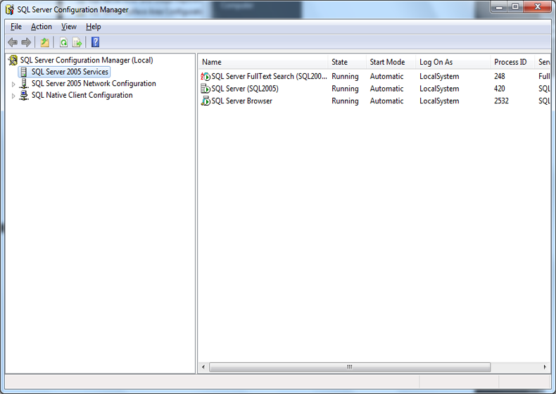 - เมื่อเลือก SQL Server Configuration Manager / ให้ทำการเลือกที่ SQL Server 2005/2008 Ser vice ที่ด้านซ้าย แล้วจะแสดง Service ต่างๆทางด้านขวา จะแสดงหน้าต่างดังรูป