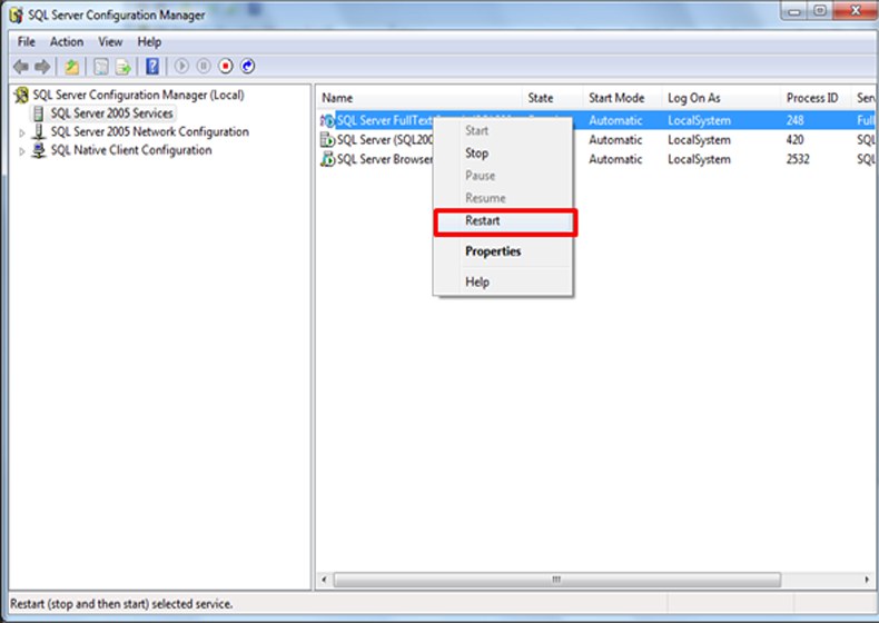 การ Restart Service ของ SQL Server กรณีลูกค้าใช้ SQL 2005/SQL2005 Express/SQL2008R2