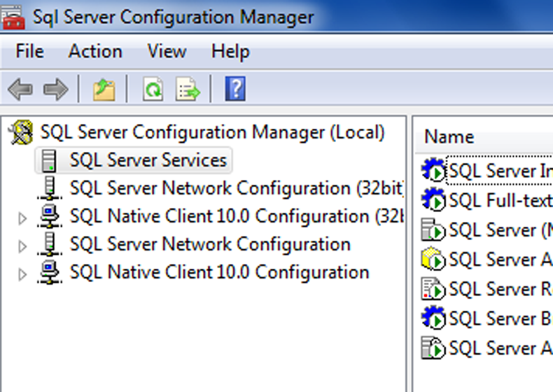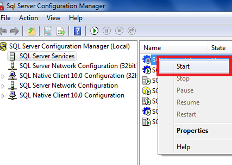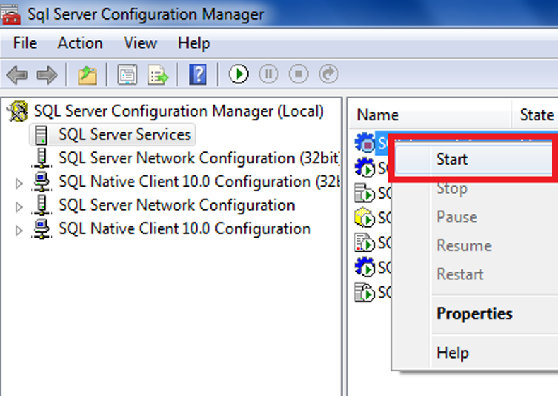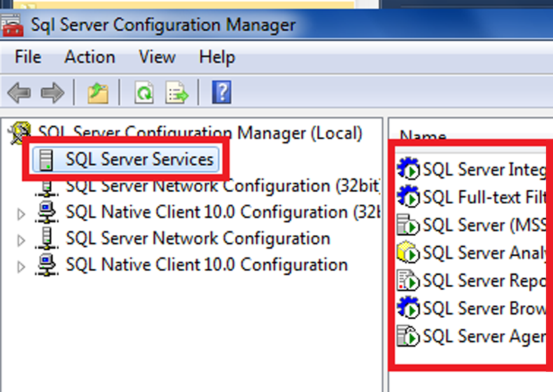 2.คลิกที่ SQL Server Services แล้วทำการ Start Service SQL ต่างๆ