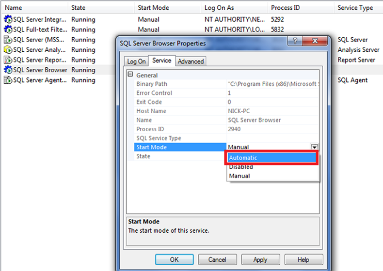 5.เลือก Tab Service แล้วให้ไป ที่ Start Mode เลือก Automatic