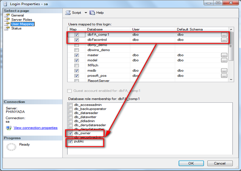 เลือกที่ User Mapping คลิกที่ช่อง Map สำหรับฐานข้อมูล Fixed Assets และเลือกที่ช่อง db_owner และ public จากนั้นกด OK ดังภาพ