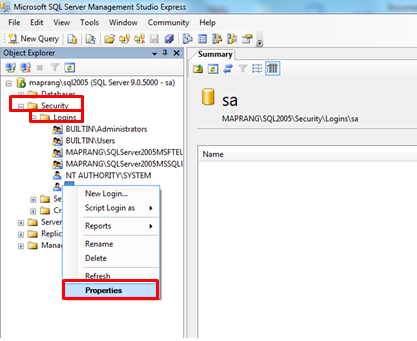 ไปที่ security > Login > เลือก User ที่สร้างขึ้นมา (ตัวอย่างจะเป็น SA)> คลิกขวา เลือก properties