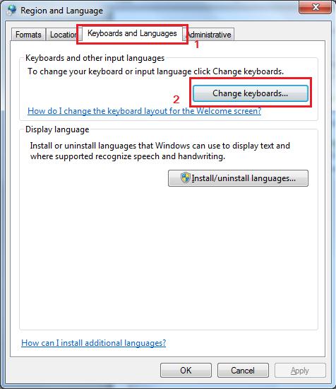เลือกที่แถบ Menu Keyboards and Languages เลือกปุ่ม Change keyboards
