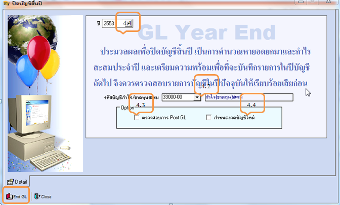 4.3 ใช้สำหรับกรณีก่อนที่จะทำการปิดบัญชีสิ้นปีให้โปรแกรมตรวจเช็คการ Post GL ว่ามีรายการใดในระบบที่ควรจะ Post GLแต่ยังไม่มีการ Post