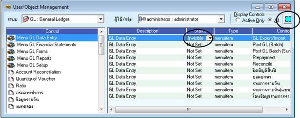 Active Only   เป็นการแสดงรายการที่มีการกำหนดสิทธิ์ไว้เท่านั้น