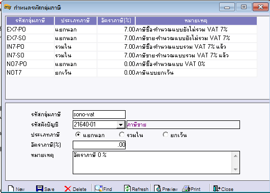 • เลือกรหัสกลุ่มภาษี แยกนอก อัตรา0% (รหัสกลุ่มภาษีที่ได้บันทึกที่ ระบบ กำหนดรหัสกลุ่มภาษี)