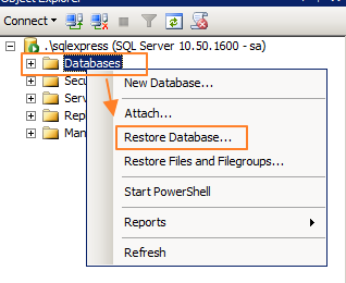 - หรือ Restore Database โดยคลิกขวาที่ Database เลือก Restore Database