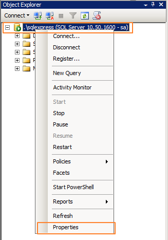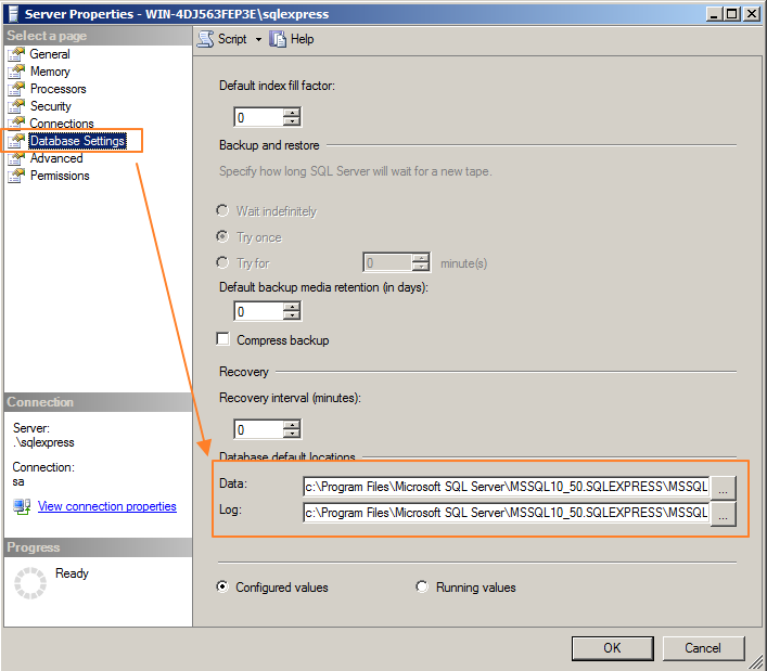 3. จะได้หน้าต่าง server Properties ขึ้นมา คลิกเลือกที่ Database Settings ตรวจสอบด้านล่างของหน้าต่างที่ Database default locations จะมี Data กับ Log