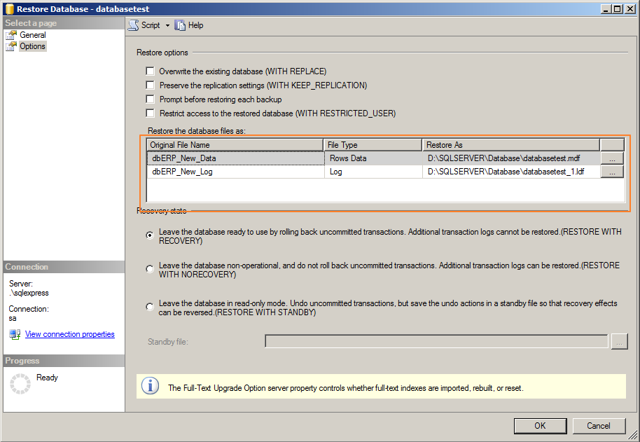 - คลิกที่ Option จะเห็นได้ว่า Database ที่ Restore เข้ามาจะถูกเก็บไว้ที่ไหน